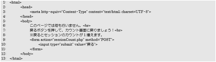sessionPageMove.phpはPHP処理を何も行わず、sessionCount.phpへ戻るボタンを設置している画面です。このファイルは別の画面に遷移して元の画面に戻っても、セッションが保存され続けていることを確認する目的になっています。