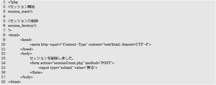 sessionDelete.phpはセッションを削除する処理と、sessionCount.phpへ戻るボタンを設置している画面です。