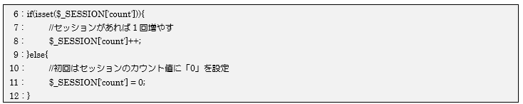 6~12行目でセッション$_SESSION[‘count’]が保存されているのか、isset関数を使って確認しています。なければelseブロックで初めてセッションにカウント数「0」を保存し、あれば$_SESSION[‘count’]に保存されたカウント数を1増やす(インクリメント)処理を行っています。