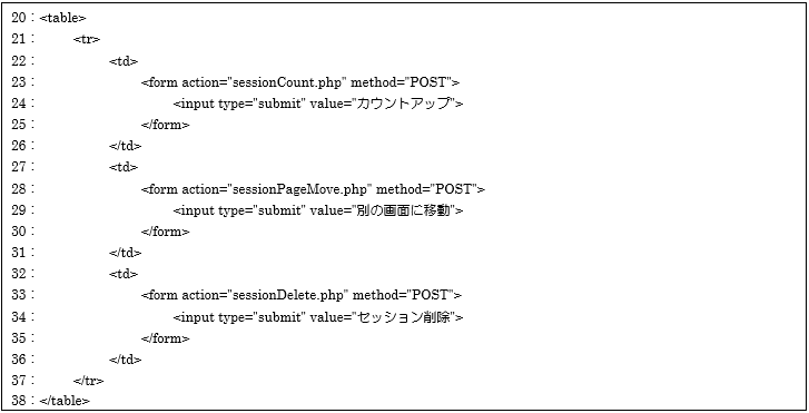 20~38行目は普通のHTML文章ですが、少し説明をしておきます。ここでテーブルタグを利用している理由は、フォームタグを3つ記述しただけだと、フォーム部品のボタンが横にではなく縦に3つ並ぶことになるからです。そこでテーブルタグで1行(<tr>)のセル(<td>)の中にフォームタグを記述することで、ボタンを横に並べて画面に表示することができます。