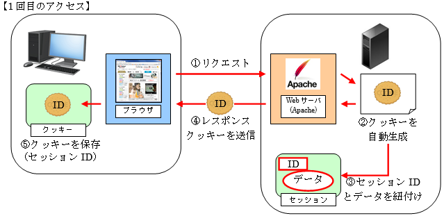 まず、プログラムにアクセスしセッションを利用するとセッションIDが生成され、最初の画面の表示と同時にクッキーに登録されます。その際、サーバ上のセッションのデータにも同じセッションIDが紐付けられます。