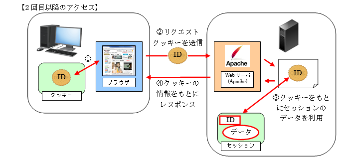 2回目以降のアクセス時には、リクエストと一緒にサーバに送信されたクッキー(セッションID)をもとに、セッションのデータを参照することができます。