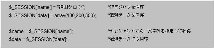 セッションの開始宣言を行った後は、スーパグローバル変数を利用してデータの保存や取得を行います。
