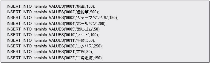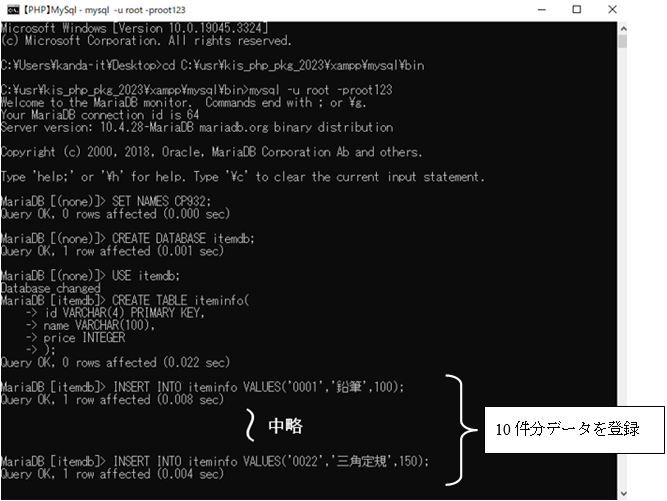 コマンドプロンプトから次のSQL文を実行して、データベースとテーブルの作成、また、サンプルデータの登録を行なってください。