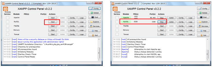 ※この後PHPプログラムも動作させるため「Apache」も起動しておきます。