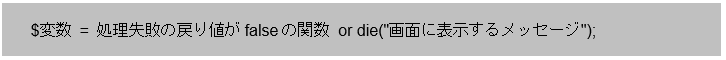 「or」はこれまで目にしてきた論理演算子です。条件式で使われるのが一般的な使い方ですが、通常の処理にも使うことができます。この書式では左側の「処理失敗の戻り値がfalseの関数」の戻り値が「true(false以外)」なら条件を満たすため、右側の処理は行いません。逆に「false」ならば右側のdie関数の処理を行うことになります。