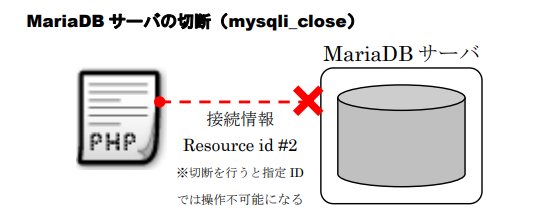- MariaDBサーバ接続の切断:mysqli_close関数