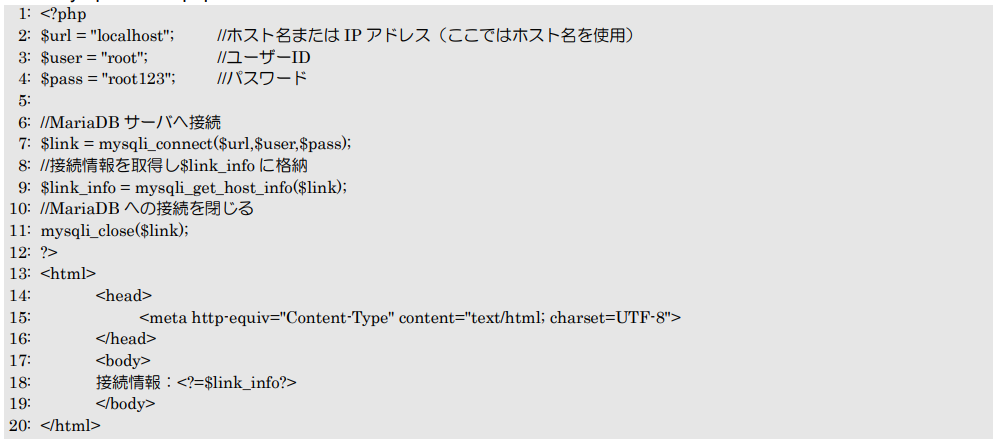 PHPからMariaDBサーバへ接続して切断し、接続情報を画面に表示して確認します。