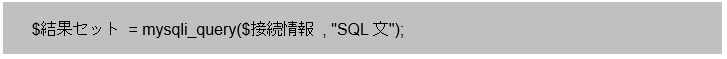 - データベースへSQL文の発行:mysqli_query関数(SQL文の種類は問わない)