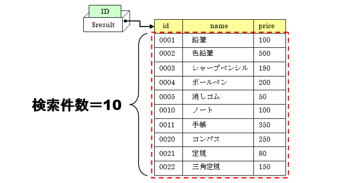 引数の$変数はSQL文を発行した際の戻り値「結果セット(ID)」を設定します。