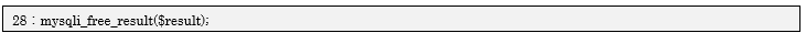 28行目では結果セットを利用する処理がないので、mysqli_free_result関数を使って開放(削除)を行います。