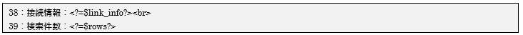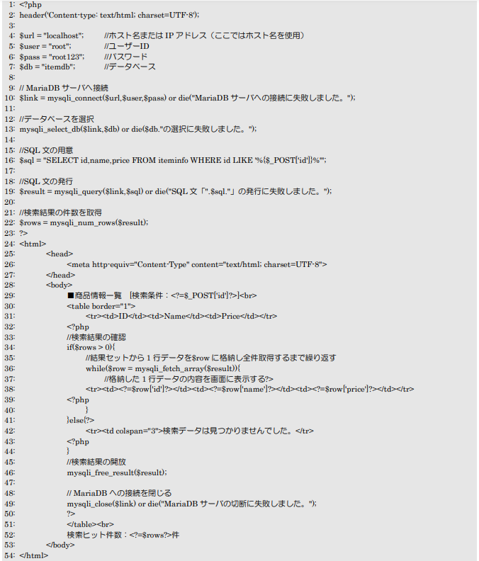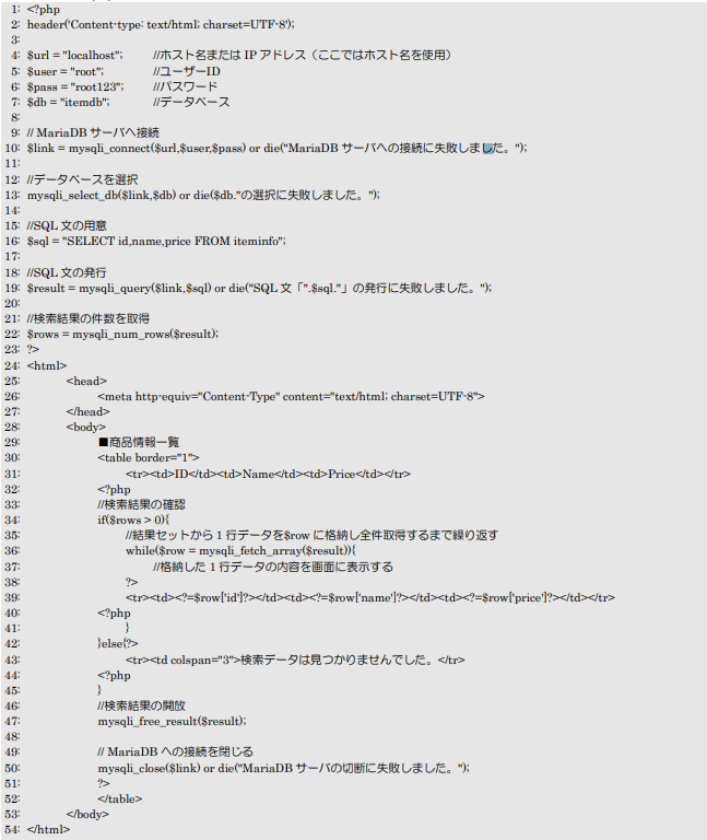今回のプログラムは前項の内容に修正を行い、iteminfoテーブルを検索した結果のデータ全てを画面に表示するようしています。22行目までは前項と同じ処理を行っており、それ以降はHTML文章の間(32~51行目)で処理を行うようにしています。
