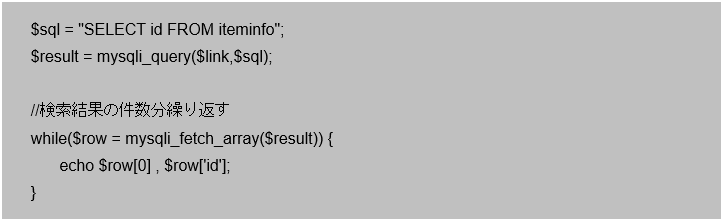 凡例ではiteminfoテーブルからidの項目を1つだけで、データを全件取得するようにしています。このSQL文の結果セットから、mysqli_fetch_array関数を使って読み取れるのは項目idだけになります。1行データが代入される$rowには数値キー「0」と「id」両方で1行目データの値が取得できます。1行データが取得出来ない場合は「false」が$rowに代入されるので、while文を抜ける仕組みになります。この処理は10章で学習した、読み込みファイルデータを全て取得する仕組みにとても似ています。この後のプログラムでイメージを交えて解説を行います。