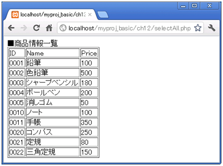 アクセスURL:http://localhost/myproj_basic/ch12/selectAll.php