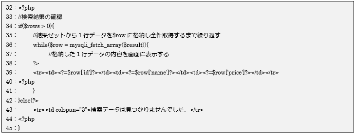 データが1件も無かった場合はelseブロックの43行目の処理を行い、画面に検索結果がなかったメッセージを表示します。データが1件以上あればifブロックの35~41行目の処理を行い、while文mysqli_fetch_array関数を組み合わせて検索結果のデータを全て取得し、1行データの結果を画面に表示しています。