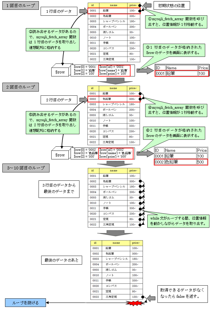 このmysqli_fetch_array関数の基本的な仕組みは、「位置情報の移動を先に行う、配列データの作成方法が違う」だけで、10章で学習したfgetcsv関数に似た仕組みになっています。