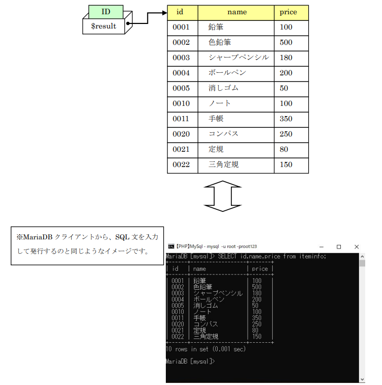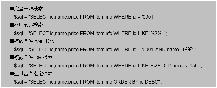 条件はidだけではなくテーブルにある項目ならname、priceを使っても大丈夫です。ANDやORで複数の項目を条件に設定することもできます。上記凡例を見て分かりますが、PHPから発行できるSQL文はMariaDBで行えるものと同じです。