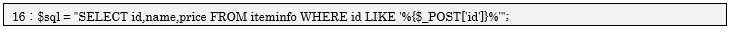 一番重要な部分は16行目のSQL文になります。このSELECT文はPOSTデータのIDを検索条件に組み込んでいます。結果として、「iteminfoテーブルのidに入力ID($_POST[‘id’])が含まれているものを検索しなさい」と言うSELECT文になります。条件を設定したい場合は、テーブル名の後に「WHERE句」を付けます。また条件に「LIKE文の’%入力ID%’」としているので、入力IDを含むあいまい検索にすることができます。
