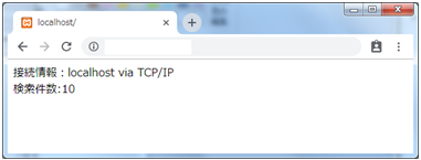 38~39行目で接続情報と検索件数を画面に表示しています。検索件数は現在のiteminfoテーブルのデータの件数10が正しく表示されていることが確認できます。