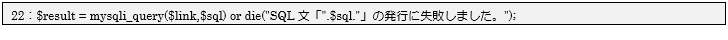 19行目でデータベースに発行するSQL文(SELECT文)を変数$sqlに用意します。