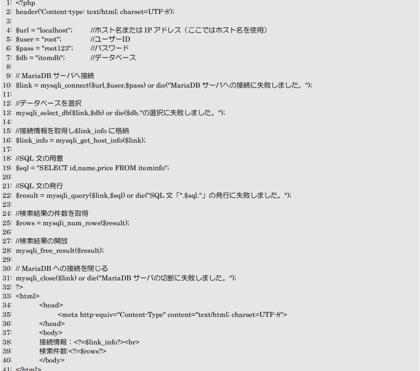 47行目で結果セットはこの後の処理で使用しないため開放を行い、最後に50行目でMariaDBサーバの切断を行っています。