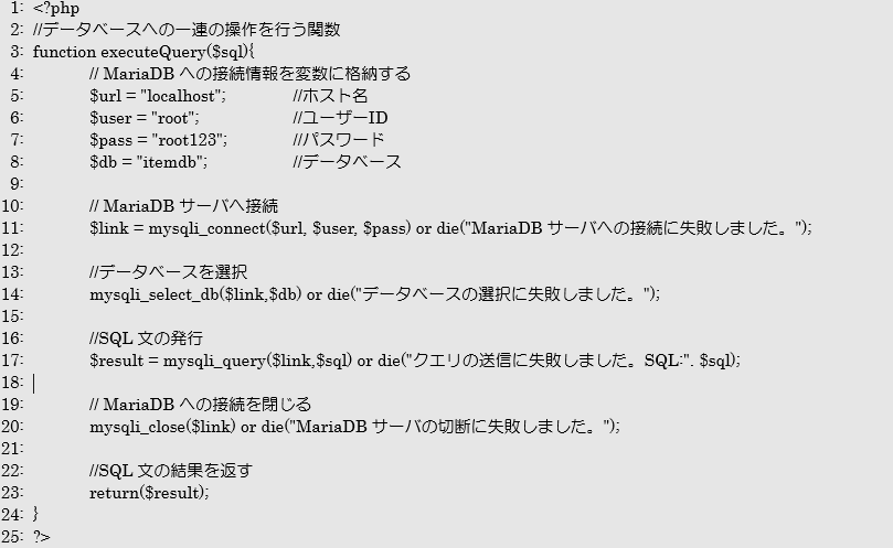 MariaDBサーバに必要な情報を変数に用意しておき、その情報を元にMariaDBサーバへ接続します。
