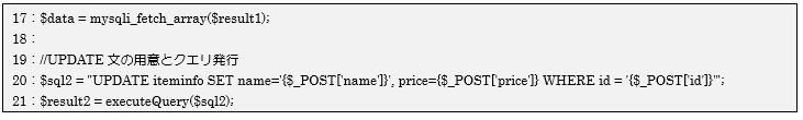 更新対象のデータがあればifブロックの処理に進み、17行目は更新対象の更新前データをmysqli_fetch_array関数で取得して変数$dataに受け取っています。