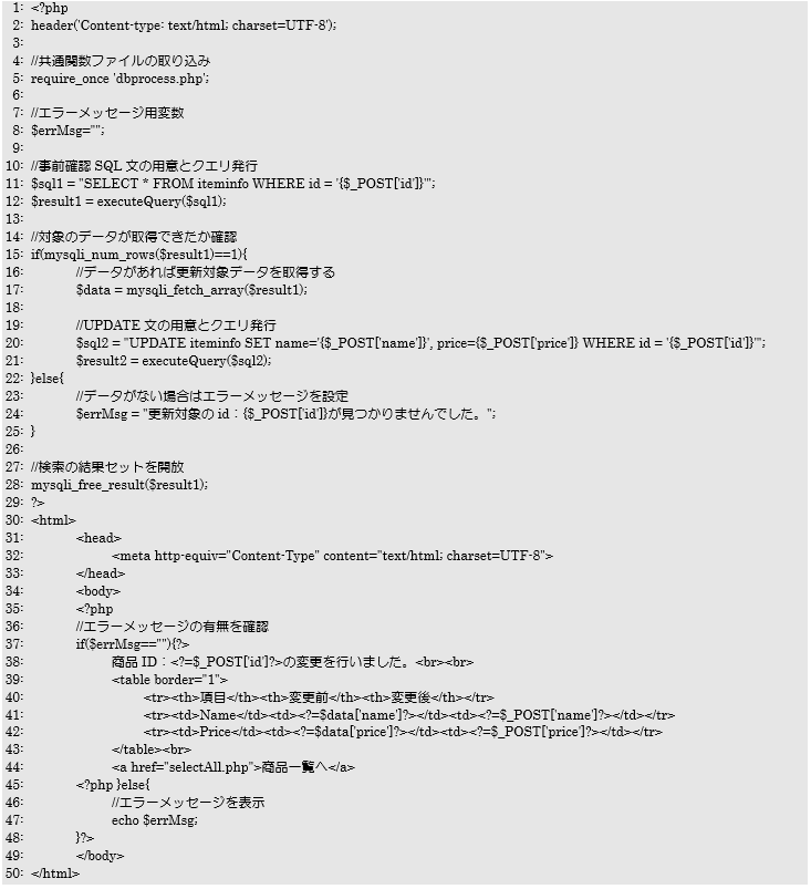 まずはデータベース操作に関する処理を前項で作成した共通関数「executeQuery関数」で行います。さらに、更新対象のデータがデータベースに存在するのかも確認します。その結果データがあれば更新処理を行い、なければエラーメッセージを画面に表示します。