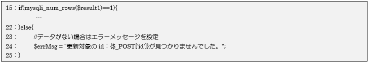 15~25行目はmysqli_num_rows関数を使って更新対象のデータが取得できたのか確認しています。検索に該当すると1件データが取れるのでifブロックの処理を行い、データがない場合はelseブロックの処理を行い変数$errMsgにエラーメッセージを設定します。