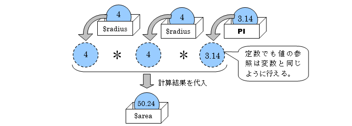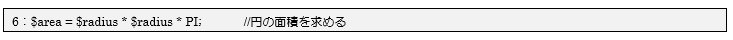 6行目では「変数$radius」の値と、「定数PI」の値を参照して円の面積を求めて変数$areaに代入しています。