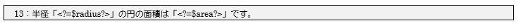 13行目の処理でHTML文章内にショートタグを利用して、変数$radiusと$areaの結果を出力しています。実行結果からも確認できますが、画面に入力した半径の数値「4」と円の面積「50.24」が正しく表示されています。