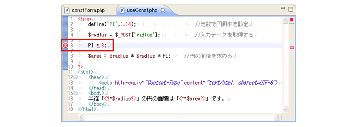 今回のプログラムは、データを入力するWeb画面の「constForm.php」と、その画面からのデータ受け取り先の「useConst.php」の2つのファイルから構成されています。解説は定数を扱う「useConst.php」に関して行っていきます。