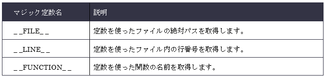 マジック定数の名前の前後には「_(アンダーバー)」と呼ばれる横棒を2つ並べています。上記の表で示したもの以外にも、PHPのVerで使えるマジック定数が増えていますので、公式ページを参照してくみてください。