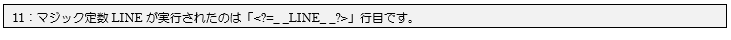 11行目ではマジック定数「_ _LINE_ _ 」の結果を、そのままショートタグを使って表示しています。この処理は11行目に記述しているので、実行結果にも「11」行目ですと正しく表示されているのが確認できます。