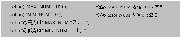 定数をプログラムで利用するための手順を紹介していきます。定数を作成するには「define関数」を利用しておこないます。