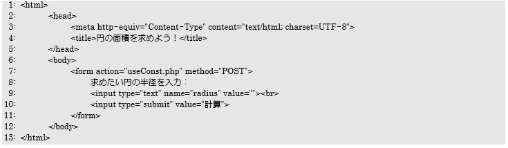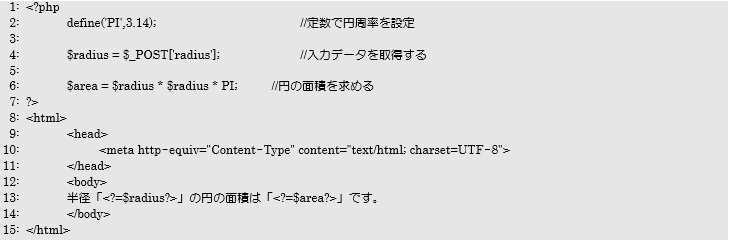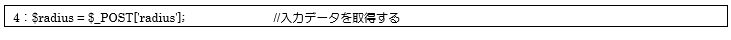 4行目ではconstForm.phpからの入力データの値を$_POSTで取得して、変数$radiusに代入しています。
