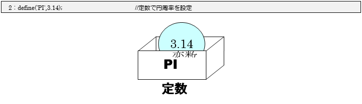 2行目で今回のポイントである定数を、define関数を利用して「PI」に「3.14」の値を設定しています。