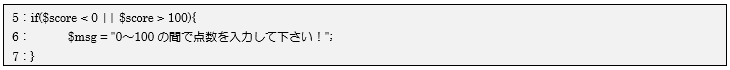 5~7行目の処理で入力点数が有効範囲の値なのかをチェックしています。この場合は「$scoreが-1以下、または101以上」の場合にtrueになりifブロックの処理を行います。