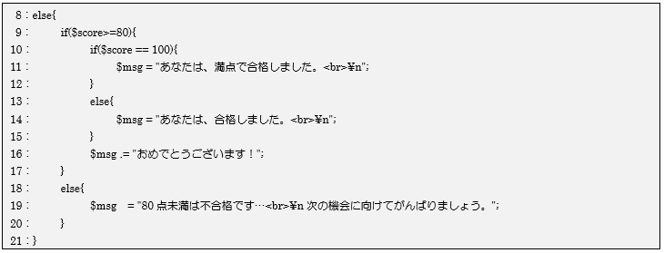 10行目でさらに点数のチェックを行い、点数が100なら11行の処理を行い、そうでなければ14行の処理を行います。10~15行の間の共通処理として、16行目で「.=」で文字列の結合を行います。