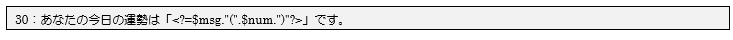 30行目で運勢結果とランダムで発生させた数値の確認のために、変数$numの値を画面に表示させています。