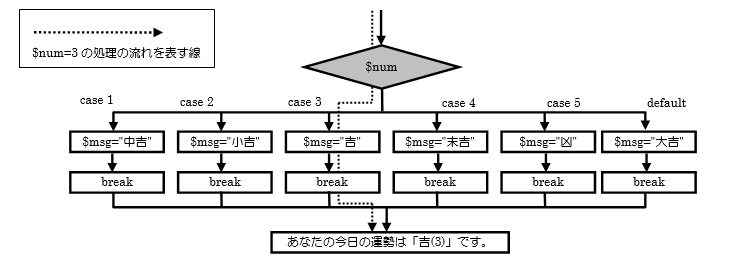 case 3: … 変数$numの値が3なら、変数$msgに「吉」を代入してswitch文を抜けます。