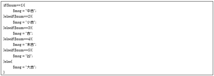 case 2: … 変数$numの値が2なら、変数$msgに「小吉」を代入してswitch文を抜けます。