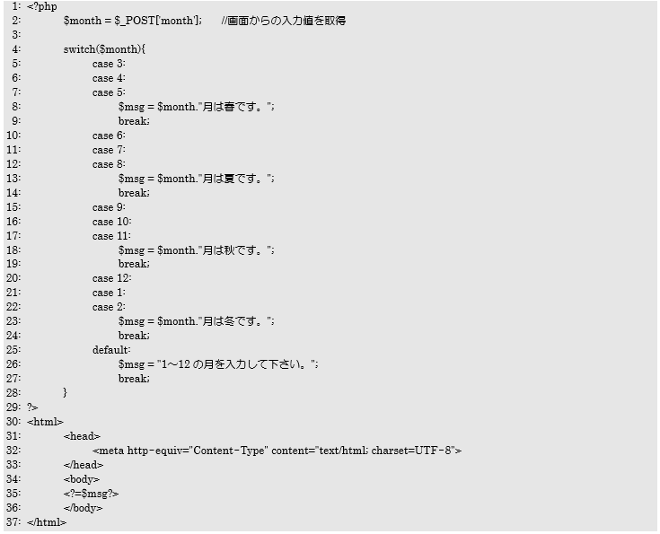 今回のプログラムはswitchForm.phpから入力した数値(月)をuseSwitch2.phpで受け取り、その結果をbreak文を一部含まないswitch文で条件判定を行います。