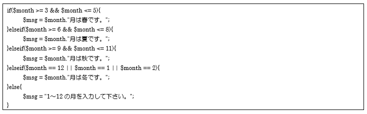 case 8の場合:変数$msgに「$month.”月は夏です。”」を代入しswitch文を抜けます。