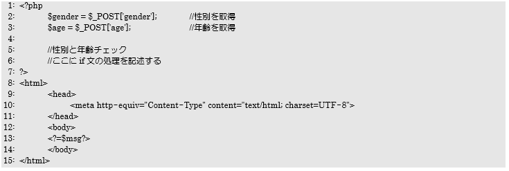 女性の場合ifブロック内でさらにif文のネストを利用し、「年齢が16以上」か判定を行う。もしも16以上ならifブロックの処理で、変数$msgに「$gender.”の”.$age.”歳は、結婚ができる年齢ですね。”」代入し、そうでなければelseブロックの処理で、変数$msgに「$gender.”の”.$age.”歳は、まだ結婚ができない年齢ですね。”」を代入します。