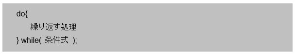 - do~while文は条件を後に判定し、必ず1回は内部の処理を実行する。但し繰り返しは1回も行わない場合もある。