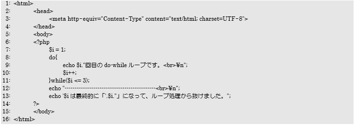 7行目でdo~while文の条件式に使用する、カウンタ変数$iを初期値1で設定しています。