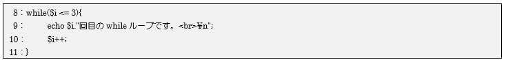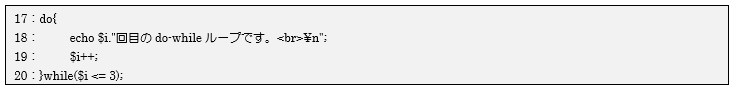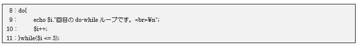 8~11行目がdo~while文の繰り返し処理になり、条件式には「$iが3以下」の場合繰り返すように設定しています。