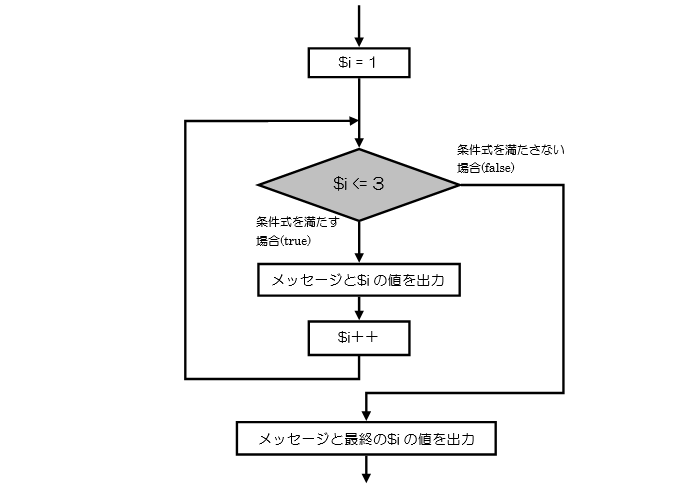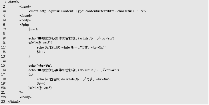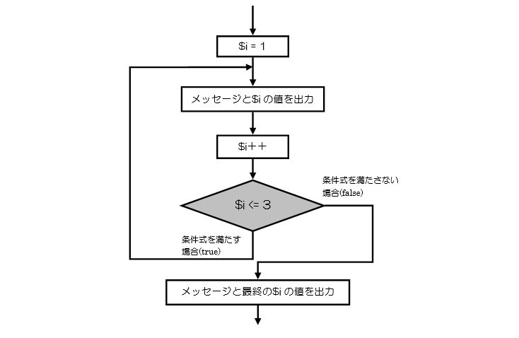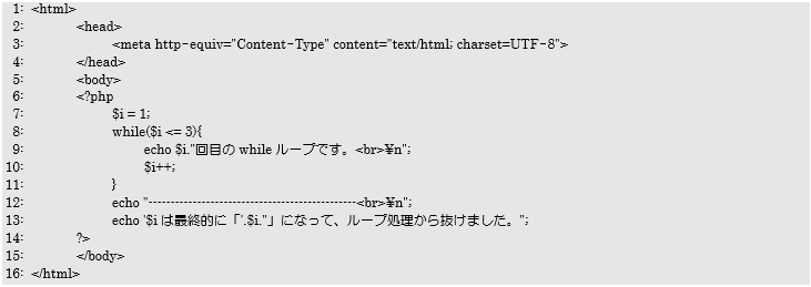 10~13行目がwhile文になりますが、10行目の条件式は$iが3以下の場合繰り返しますが、カウンタ変数$iの初期値は4になっているため内部の処理は行わず、そのままwhile文を抜けます。