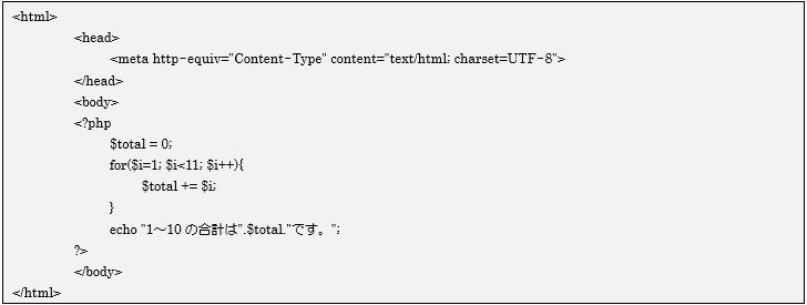 問2 以下に示すサンプルのfor文をwhile文に変更したpractice0401.phpを作成しなさい。